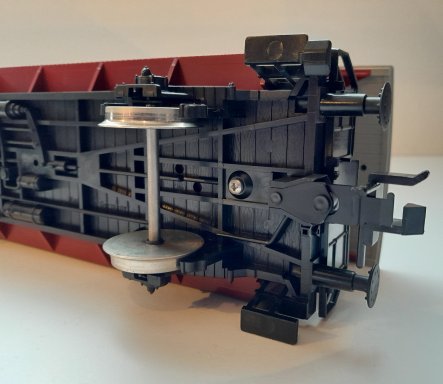 Dit rode rijtuig heeft een zwart onderstel, grijs dak, verende buffers en te openen deuren.