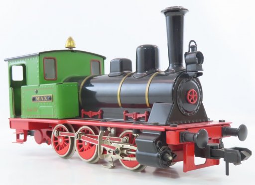 Alle 3 assen aangedreven, met frontverlichting aan ketelzijde, bedrijfsnaam MAX, loc nummer 01.
